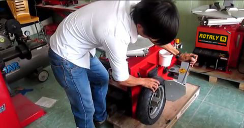 3. Tiếp theo đưa lốp lên bàn kẹp - máy ra vào lốp xe máy.