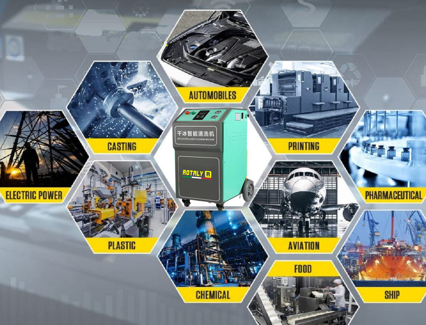 Máy bắn đá khô dùng trong vệ sinh công nghiệp: Máy làm đá khô được sử dụng rộng rãi trong lĩnh vực công nghiệp để làm sạch máy móc thiết bị, dây chuyền sản xuất, đường ống và bề mặt,.. Tác động tốc độ cao và hiệu ứng nhiệt độ thấp của nó nhanh chóng loại bỏ dầu mỡ, bụi bẩn và cặn, nâng cao hiệu quả và chất lượng sản xuất.