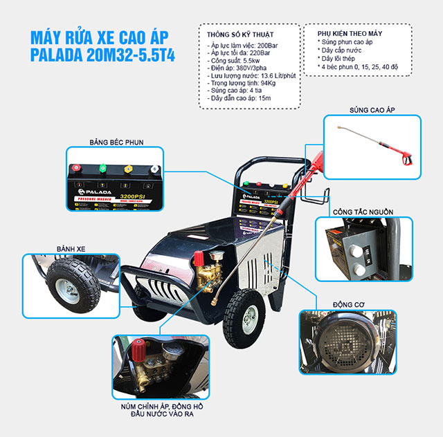 Máy rửa xe chuyên dụng Palada 20M32-5.5T4 với áp lực nước lớn, công suất đạt 5.5KW, áp lực nước lên tới 230 bar, lưu lượng nước đạt 13,6 lít/phút cho phép máy có thể loại bỏ triệt để các bụi bẩn cứng đầu, nước dơ bám dính trên thân xe và làm sạch sâu những vị trí khó tiếp cận như gầm xe ô tô, bánh xe,...mang lại hiệu quả làm sạch vô cùng ấn tượng.